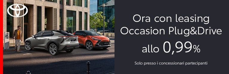 La promozione è disponibile su tutti i veicoli elettrici e ibridi plug-in Occasion Plus di Toyota e presso i partner Toyota aderenti. Per le offerte di leasing l’acconto non è obbligatorio. La concessione del leasing è vietata se causa un eccessivo indebitamento. La promozione di vendita è valida per contratti stipulati tra il 1° novembre al 31 dicembre 2025 o fino a revoca. Valide solo per veicoli Occasion Plus nel mercato dell’usato Toyota.